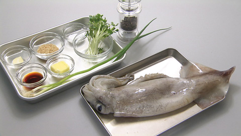 - 全体にバターとイカとワタの味が混ざったら、醤油を鍋肌から加えて少し焦がすように炒める。