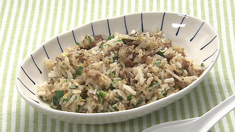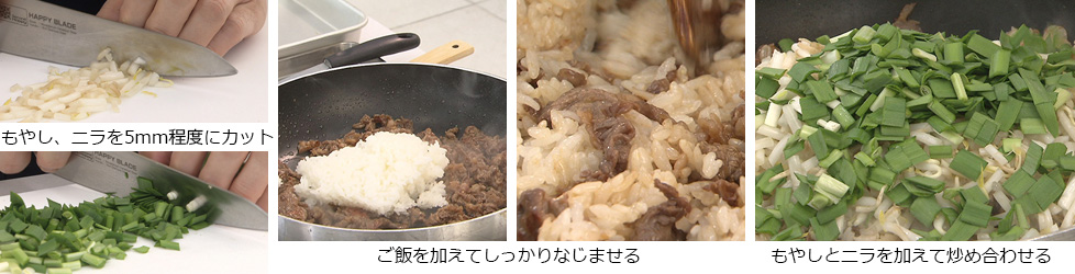 - そこにご飯を加えて解し炒めます。全体がパラっとなったらもやしとニラを加えて炒め合わせていきます。