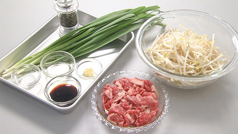 - 牛こま肉は、粗く刻んで、オイスターソースとおろしニンニクで下味をつけます。