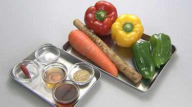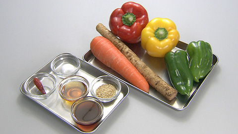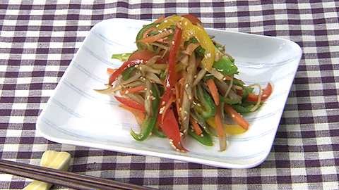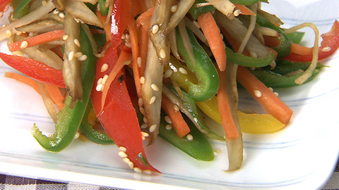 - 全体がしんなりとなってきたら残ったピーマンと鷹の爪を混ぜ炒め、最後に炒りゴマを加えて完成。