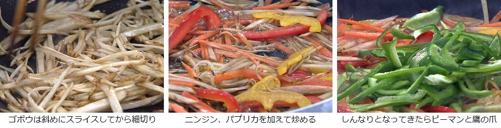 - フライパンを温めてゴマ油をひき、まずゴボウを炒めます。