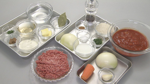 - タマネギとニンジンを炒めて、タマネギが多少しんなりしてきたら、水、カットトマト缶、白ワイン、ローリエをちょっとだけ折って、固形コンソメはつぶして加えて一煮立ちさせる。