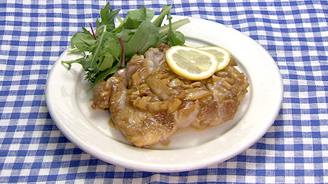 - 食べやすい大きさにカットして器に盛り付け、野菜などを添え、スライスしたレモンを飾って完成。
