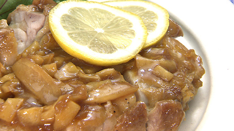 - 皮面がこんがりと焼けたら裏返して、きざんだショウガときざんだレモン、だし汁、しょう油、ハチミツ、酒を加え落し蓋をして煮汁がなくなるまで煮詰める。