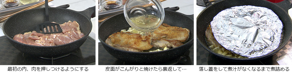 - フライパンを火にかけ温めてから鶏もも肉を皮目から焼いていく。