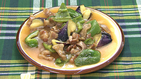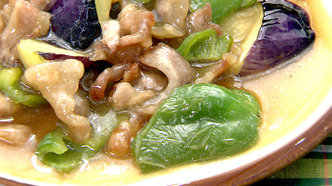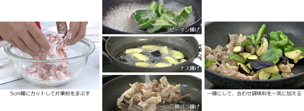 - 豚バラもこんがりと揚げて、フライパンに移し、揚げたピーマンとナスを一緒にして、合わせ調味料を一気に加える。