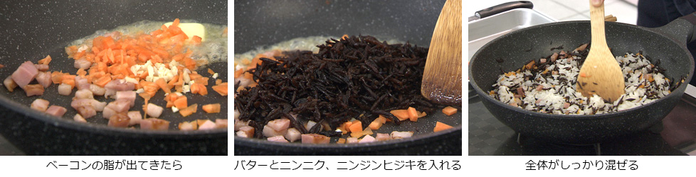 - ベーコンの脂が出てきたら、バターとニンニク、ニンジンヒジキを入れて炒めます。
