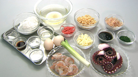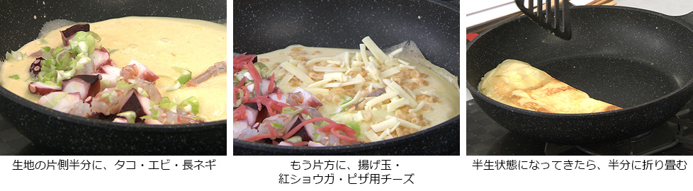 - 生地の片側半分に、タコ・エビ・長ネギを散らします。