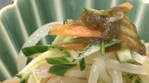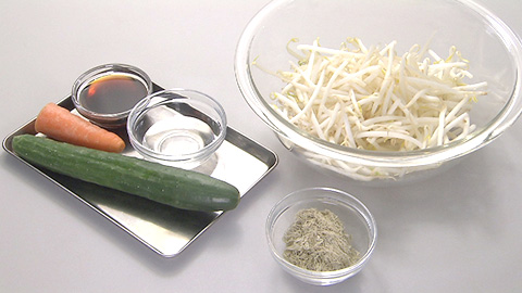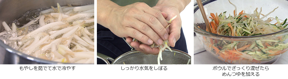 ボウルにもやし、キュウリ、ニンジンを加え、ざっくりと混ぜたら、水、めんつゆを加える。