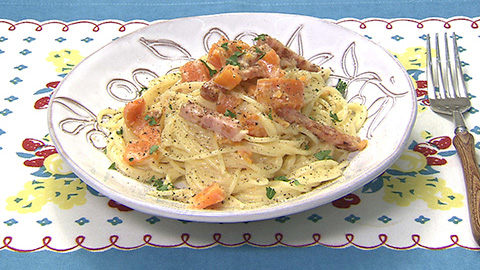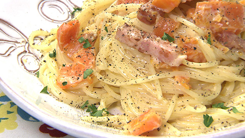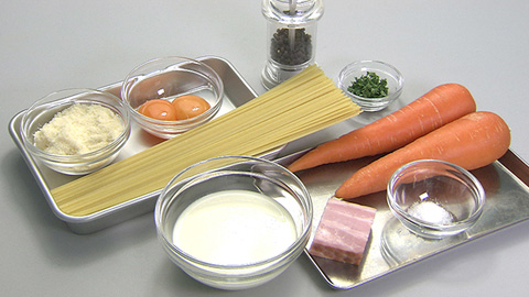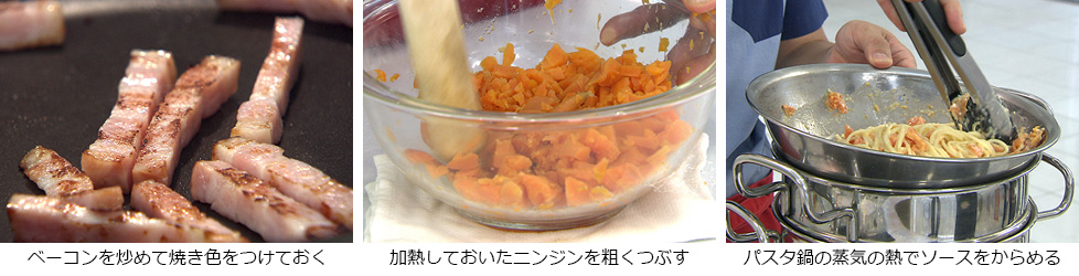 - そこに炒めておいたベーコン、ニンジンを加え、パスタ鍋の上に湯せんをするように置き、蒸気で熱を加えながらからめていく。