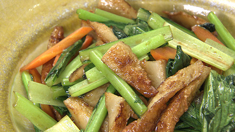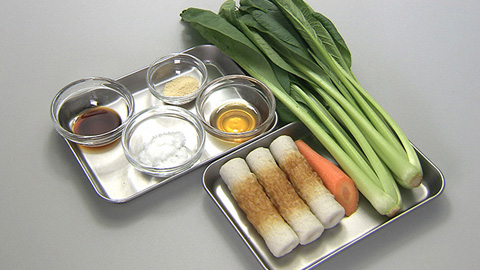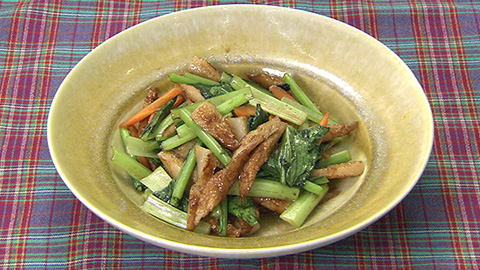 - 小松菜とニンジンを加えて鶏がらスープの素で味付けしながら仕上げの火を通して完成。