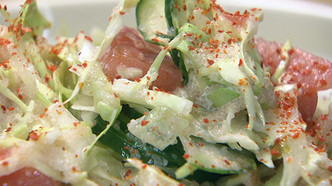 - トマトを加えてさっと和えたら器に盛り付け、お好みで一味唐辛子などをふって完成。