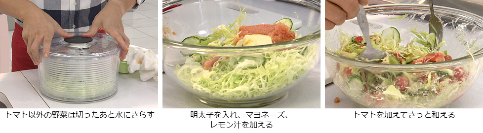 - トマト以外の野菜は、切ったあと水にさらしておき、しっかり水切りをしてボウルに。