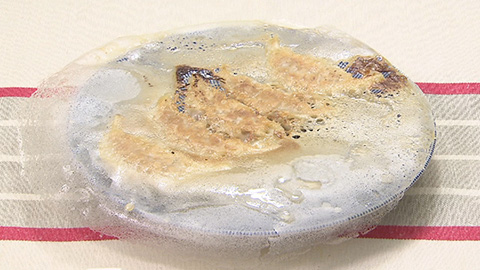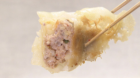 - フライパンに、包んだものをあまりくっつかないように、小分けに並べて焼いていきます。ゴマ油も、それに応じて分けてひきます。5つずつなど、羽根ができる大きさをちゃんと考えて並べてください。水に小麦粉を溶いたものを注ぎ、フタをして7~8分、蒸し焼きにします。