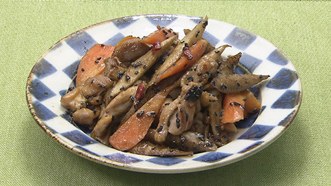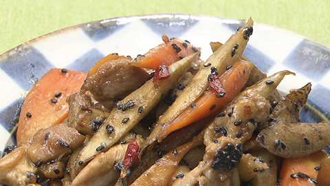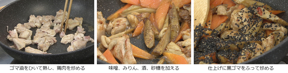 - 鶏肉の色が変わってきたらゴボウとニンジンを加える。