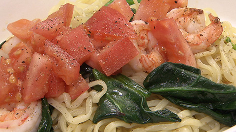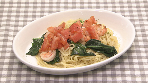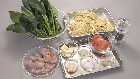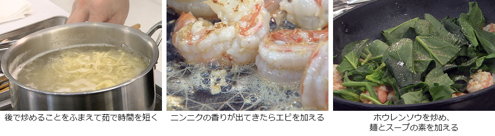 - そこにエビを加え、多少焼き色がついたらホウレンソウを加え、軽く塩コショウして炒める。