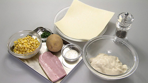- そこにマッシュしたジャガイモ、コーン、パセリ、ブラックペッパーをふり、よく混ぜて具を作ります。