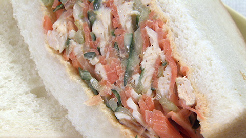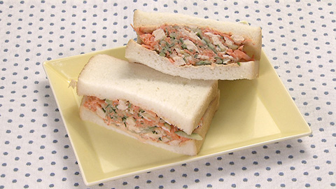 - 食パンの上にこんもりと盛り付け、もう一枚ではさみ、ラップで包み、約10分程度おく。