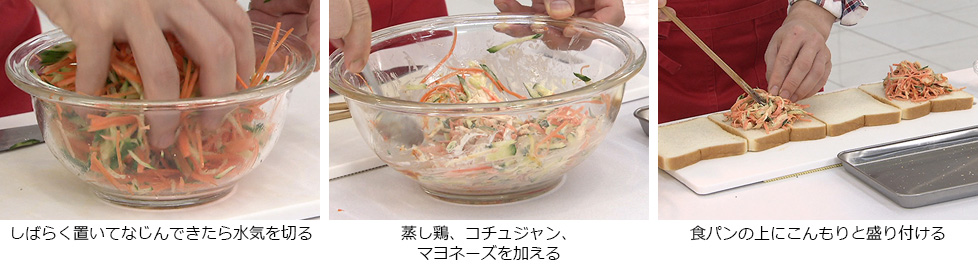 - 裂いた蒸し鶏、コチュジャン、マヨネーズを加えて混ぜる。
