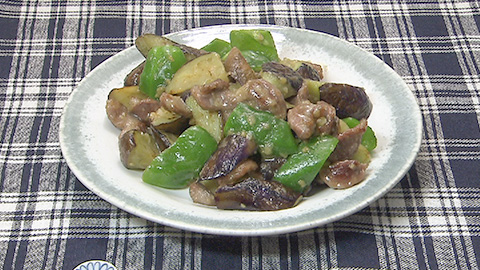 - ナスがしんなりしてきたら、鷹の爪とピーマンを加え、合わせ調味料を加える。