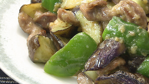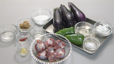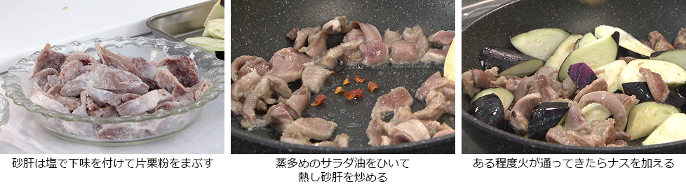 - 砂肝の色が変わりある程度火が通ってきたらナスを加えてさらに炒める。