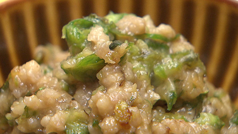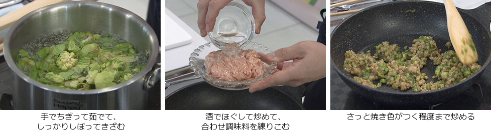 ふきのとうを加え、味噌と砂糖の照りを出しながら炒める。