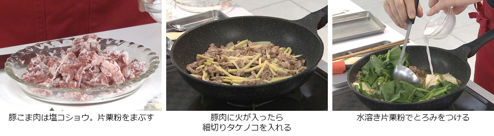 - 豚肉に火が入ったら細切りタケノコを入れ、合わせ調味料を加える。
