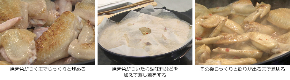 - フライパンにゴマ油をひいて熱し、手羽先を並べて焼き色がつくまでじっくりと炒めます。