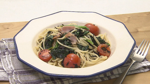 - パスタが茹で上がったらフライパンにうつし、プチトマト、コンソメ、バターとパスタの茹で汁をお玉1杯程度加え、全体を混ぜるようにからめて完成。