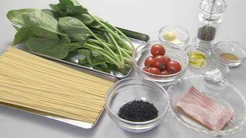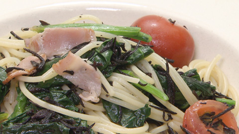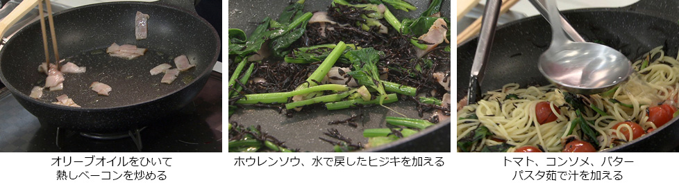 - ベーコンに焼き色がついたらホウレンソウを加え、軽く塩コショウをし、水で戻しておいたヒジキを加える。