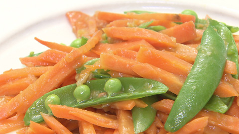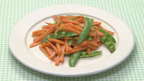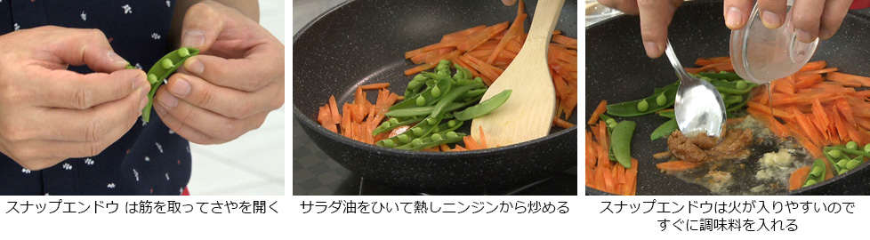 - ニンジンの色が鮮やかになってきたらスナップエンドウを加えて炒める。