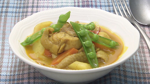- 器に盛り、あらかじめ茹でておいたスナップエンドウを添えて完成。