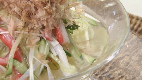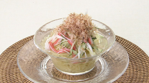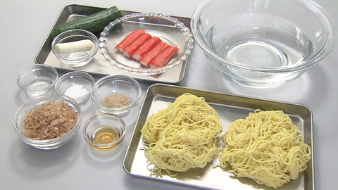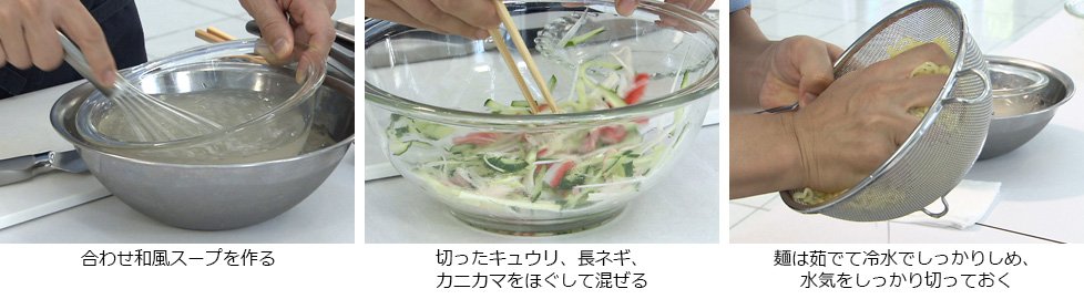 - 切ったキュウリ、長ネギ、カニカマと茹でた麺をボウルで和えて器に盛る。