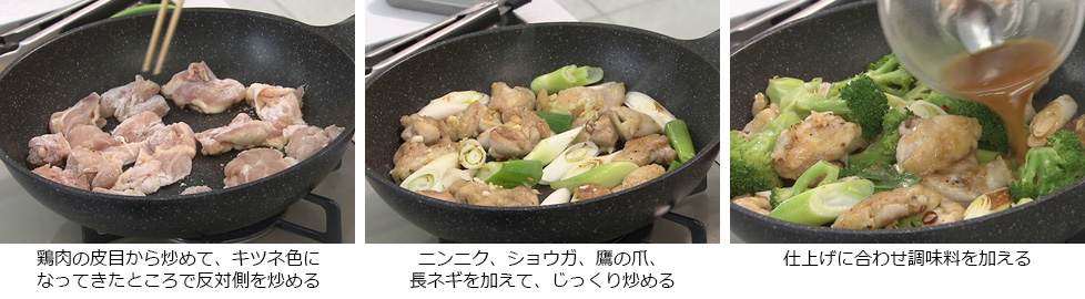 - フライパンにゴマ油をひいて熱し、鶏肉の皮目から炒める。
