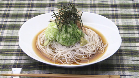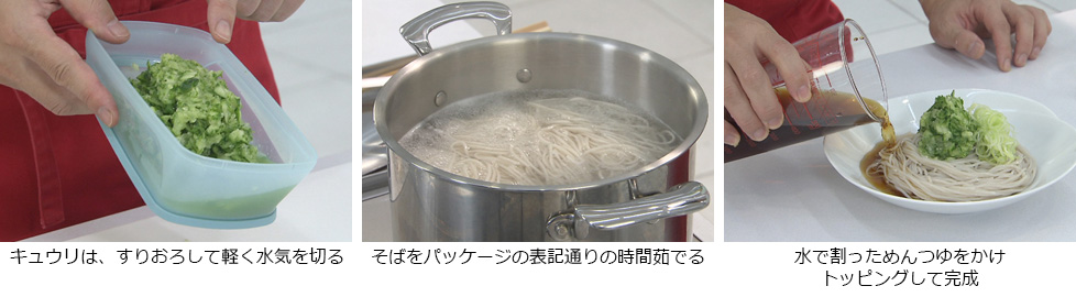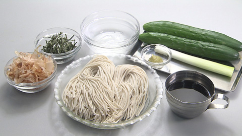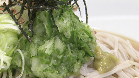 - そばを器に盛りつけ、キュウリの汁を軽くしぼって、ネギと一緒に盛りつける。