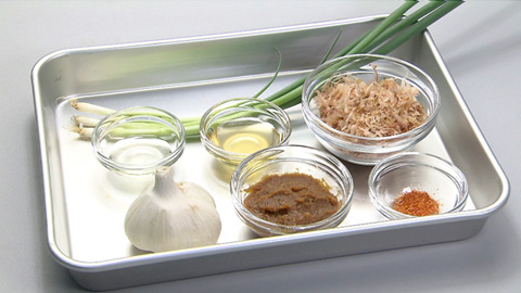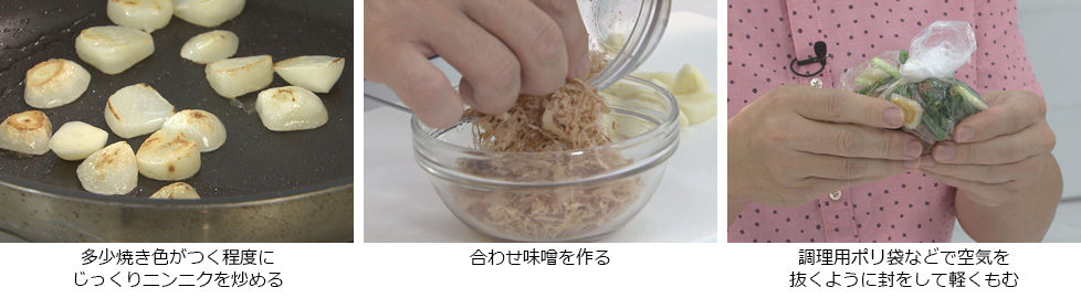 - 調理用ポリ袋などに、合わせ味噌と炒めたニンニク、切った万能ネギを入れて、空気を抜くように封をして、なじませるように軽くもむ。