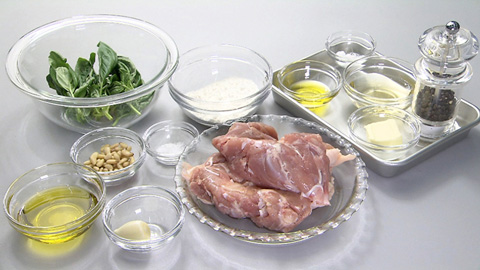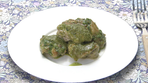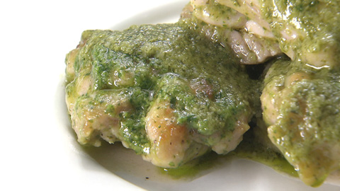 - 両面こんがりキツネ色に焼けたら、ジェノベーゼソース、白ワイン、バターを加えてからめ、塩・コショウで味を調えたら出来上がり。
