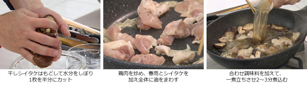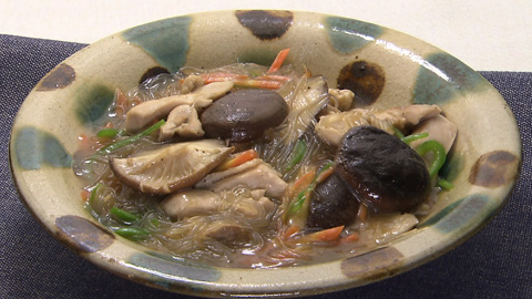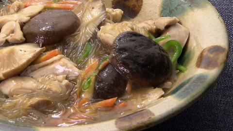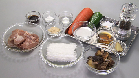 - 鶏肉を炒め、火が少し入ってきたら春雨とシイタケを加え全体に油をまわしていく。