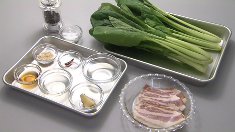 - ベーコンがほどよく焼けたら、ショウガとゴマ油、鷹の爪で風味付け。