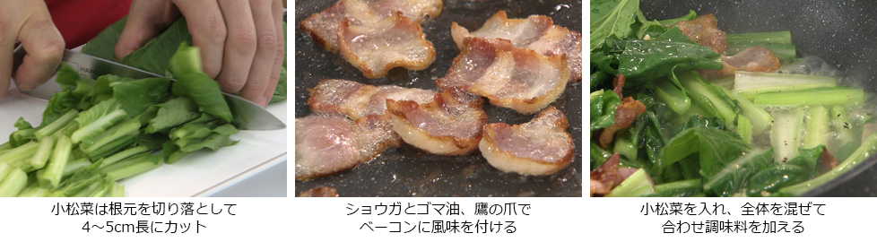 - 香りが出てきたら小松菜を入れ、全体を混ぜて、合わせ調味料を加える。