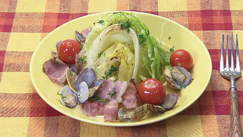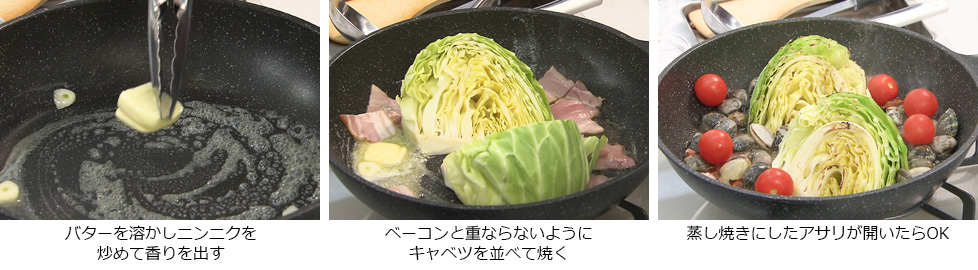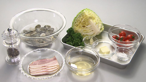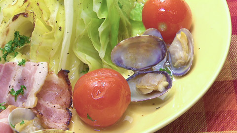 - キャベツに焼き色がついてきたらアサリ、白ワイン、プチトマトを入れて、フタをして蒸し焼きにする。