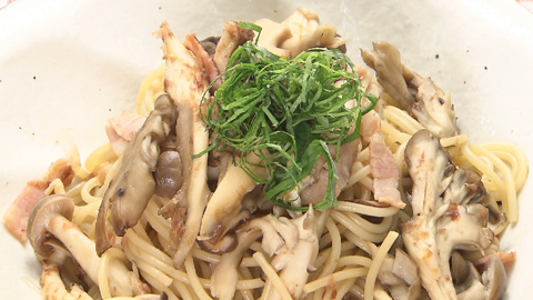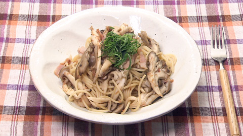 - 茹で上がったパスタをフライパンに移し、顆粒だしの素とパスタの茹で汁を加えてしっかりと混ぜ合わせる。