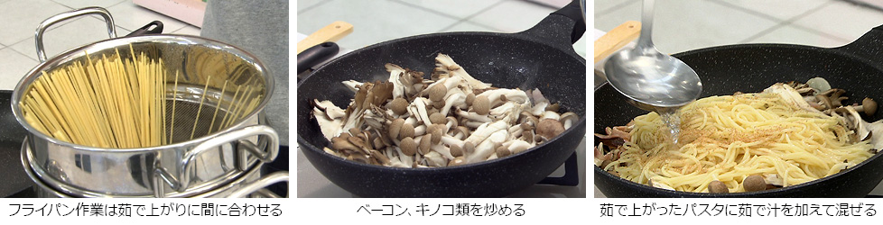 - 茹で上がりに間に合うようにフライパン作業を始める。