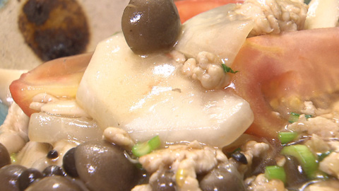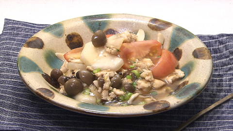 - ひき肉の色が変わってきたらシメジとエリンギ、カブを加えて炒める。