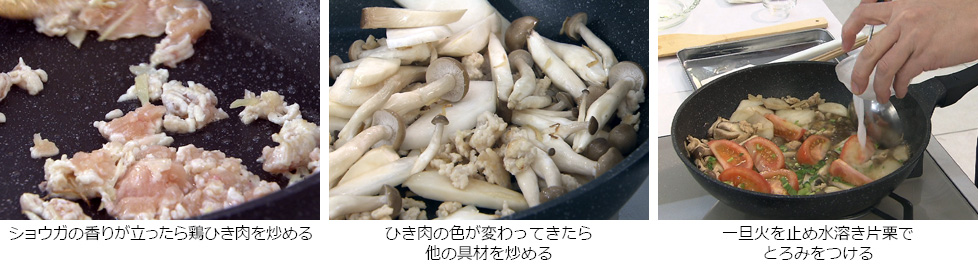 - ショウガの香りが立ってきたら鶏ひき肉をほぐし炒める。
