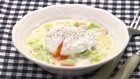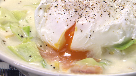- 小さめの鍋にお湯を沸かし、大さじ1程度の酢を入れて沸騰しない程度の火加減に調整したら、箸でお湯を回して流水を作る。そこに卵を1個か2個ずつ静かに割り入れそのまま3分ほど茹でてポーチドエッグを作っておく。