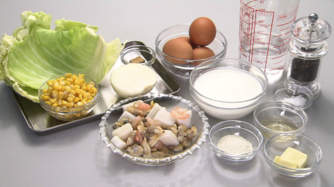 - タマネギが透き通ったらコーン、キャベツを加えて炒め、小麦粉を加えて全体をまぜる。