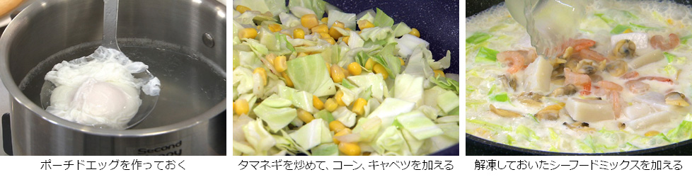 - 小麦粉のとろみが少しついてきたら、流水解凍しておいたシーフードミックスを加え、温まる程度に火を入れる。
