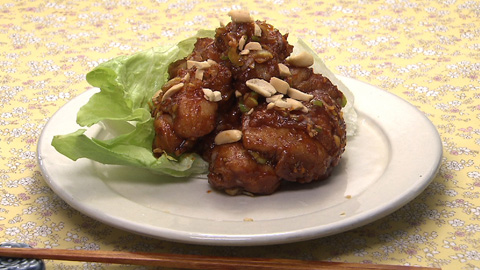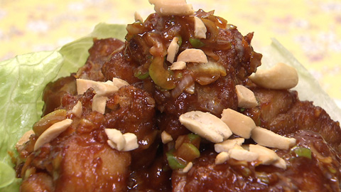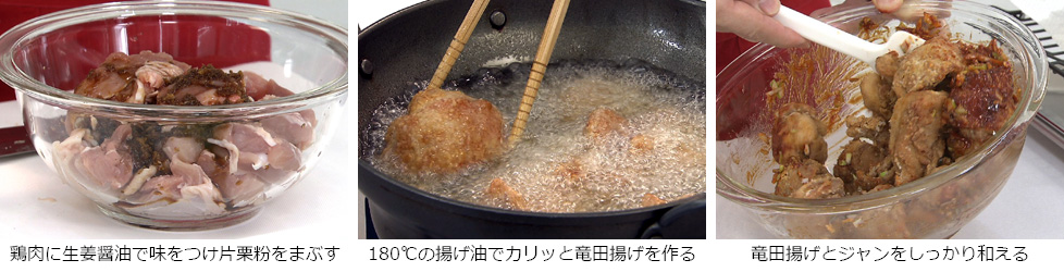 - 生姜醤油で味をつけ片栗粉をまぶした鶏肉を180℃の揚げ油でカリッとキツネ色の竜田揚げを作り、油を切っておく。