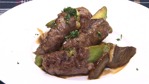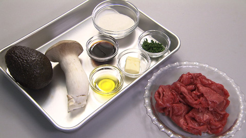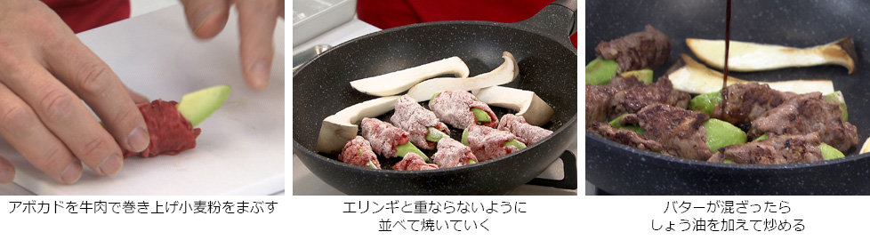 - アボカドを牛肉で巻き上げ、軽く小麦粉をまぶす。